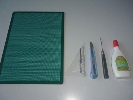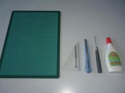 | 次の工作用具を用意しましょう。 1.カッターマット(又は厚手の紙など) 2.定規 3.カッターナイフ 4.千枚通し 5.のり(木工ボンドがおすすめ) (注意)小さなお子様は危険ですので、必ず保護者の方が付き添って下さい。 |