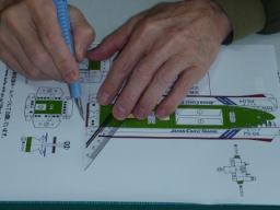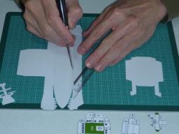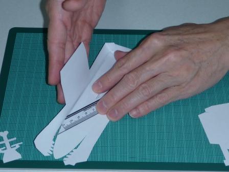 | 定規を当てながら、カッターナイフで型紙をていねいに切り取ります。 | |