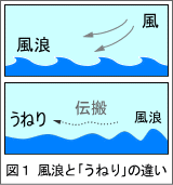 一方、「うねり」とは、離れた場所の発達した風浪が、余波となって伝わって来た波のことです。つまり、「うねり」は、その場所で吹く風とは直接関係なく起こり得るのです(図1参照)。ですから、風浪の方向と「うねり」の方向とが逆であったり、2つ以上の「うねり」が異なる方向から来たりすることもあります。夏から秋にかけて起こるいわゆる「土用波」は、はるか太平洋上にある台風が起こした「うねり」が日本沿岸まで伝わって来たものです。