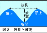 波の進行方向の長さ(波の頂上から次の頂上まで)を「波長」といい、波の谷間から頂上までの高さを「波高」といいます(図2参照)。 「風浪」は、風が強くなるほど波高は高くなりますが、波長は短く、すぐに頂上(波頭)が崩れて白波となります。