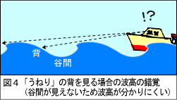 小型船が帰港する場合や陸岸近くの漁場に向かう場合は、船は「うねり」を後ろから受けて、すなわち「追い波」で航行することになります。このとき、操船者は、前方、つまり「うねり」の背を見て操船するため、「うねり」の谷間が見えず波高が分かりにくくなります。このため、「うねり」が高くなりつつあっても、これに気づかない傾向があるのです(図4参照)。これが、「うねり」の仕掛ける「第2のワナ」です。さらに、「追い波」のときは「向かい波」のときに比べ、船体の揺れや震動が緩やかに感じられるため、これも操船者の油断を誘います。