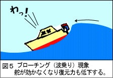 ひとつは、「ブローチング」(波乗り)といわれる現象です。強い「うねり」を船尾から受けると、船体が波乗りのようになって一気に前方に押されます。こうなると舵が効かなくなってコントロールを失い、復元力(傾いた船体が元に戻ろうとする力)も低下して、最悪の場合、あっという間に転覆してしまいます。これをブローチングといい、大型船でも転覆の主な原因となるため、昔から船乗り達が最も恐れる現象です(図5参照)。