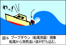 もうひとつは、「プープダウン」(船尾突襲)といわれる現象です。強い「うねり」を船尾から受けると、突然高い波が船尾から打ち込 むことがあります。船尾は船首より舷が低く、機関や燃料、漁具などの重量物があるため、波が打ち込むと一気に水没し、あっという間に転覆してしまいます。これがプープダウン現象です(図6参照)。
