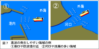 しかし実は、このような入港前の時期が最も危険なのです。なぜなら、港口や湾口は急に浅く狭くなり、防波堤からの返し波や潮流が複雑に影響して波が高くなる傾向にあります。つまり、入港前は転覆の危険性が最も高くなるのに、乗船者の波に対する注意はおろそかになるのです(図7参照)。これが、「うねり」が仕掛ける「第4のワナ」です。