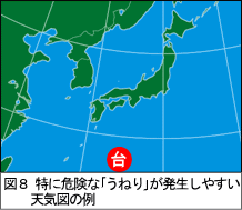 まず、新聞やテレビで天候予報を確認しましょう。風の強さや波の高さの予測が大事ですが、ただし、「風が弱く、波もおだやかでしょう」などと説明されていても、油断してはいけません。「天気図」も見てみましょう。日向灘や四国の南海上にハッキリとした“低”(低気圧)や“台”(台風)がいないかを確認するのです。これがある場合は、余波による「うねり」が宮崎県沿岸に及んでいる可能性があり、沖合は風や波がおだやかでも、陸岸近くで高波が発生する可能性があります。特に、低気圧や台風の勢力が強く、動きが遅い場合は要注意です(図8参照)。