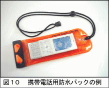 ただし、携帯電話も水没してしまえば全く役に立ちません。また、船内や道具箱などの中に入れっぱなしにして、遭難したときに手が届かず後悔しても「後の祭り」です。携帯電話は、必ず防水機能付か「防水パック」に入れたものを、ストラップなどによりしっかり身に着けておきましょう(図10参照)。