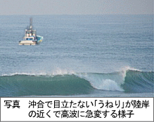 しかし、「うねり」が陸岸近くの浅い海域に達すると、海底の摩擦の影響で「うねり」の前方にブレーキがかかるため、「うねり」の後方が追いついて波長が短くなる一方波高は急激に高くなります。海底が浅くなるほどこの傾向が強くなって、ついには波頭が崩れて覆いかぶさるように岸に打ち寄せます。このように、「うねり」は、陸岸近くの浅い所で急に波高が高くなる傾向にあり、これが、風浪にない「うねり」の特性です(図3参照)。