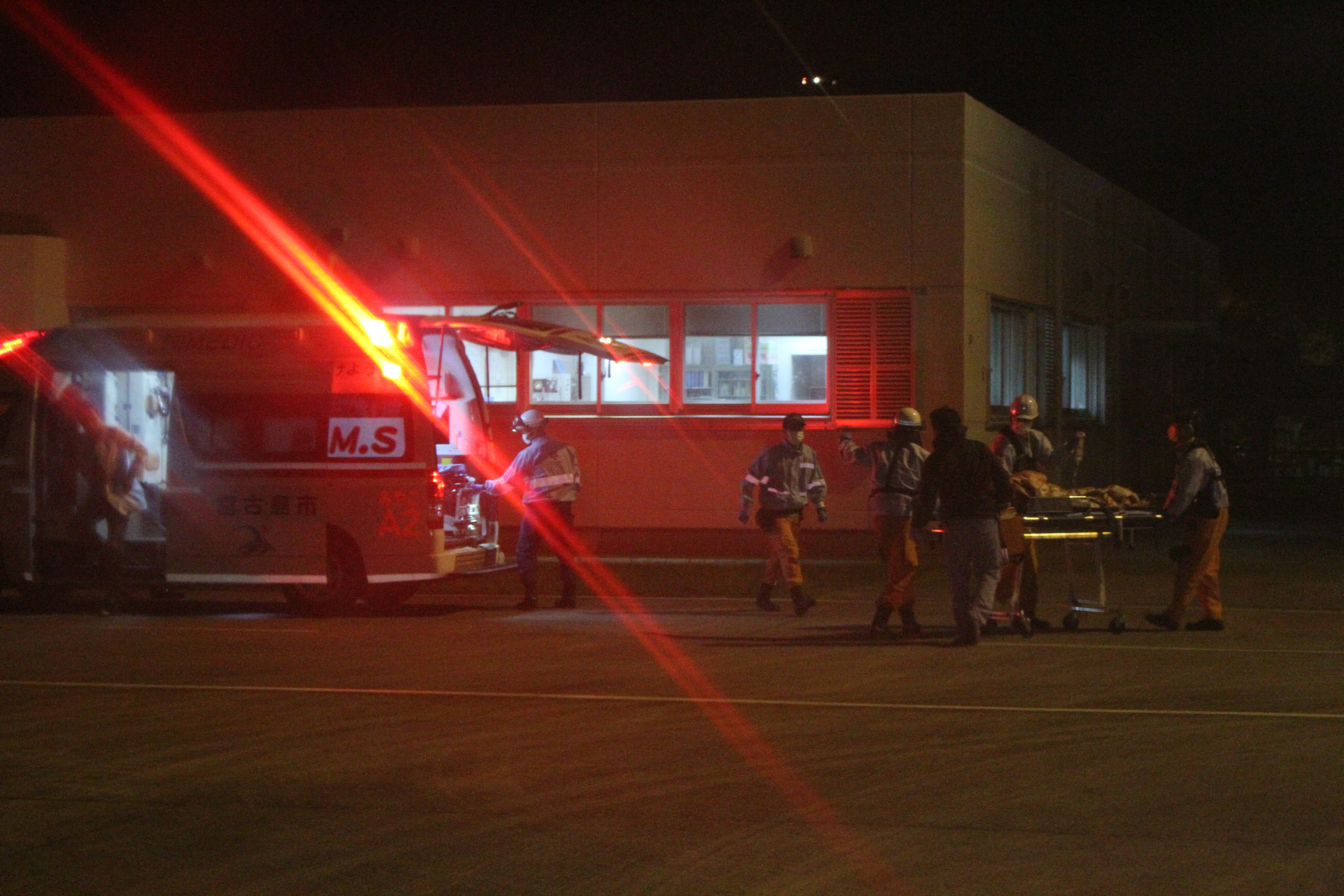 多良間島からの急患輸送 令和2年2月27日午後8時12分頃、沖縄県防災危機管理課より急患輸送要請がありました。石垣航空基地所属ヘリコプターで多良間空港から宮古空港への搬送を実施し、午後9時58分に宮古消防本部の救急車に引き継いでいます。 患者:73歳男性 写真:宮古空港にて宮古消防への引継ぎ時の様子。
