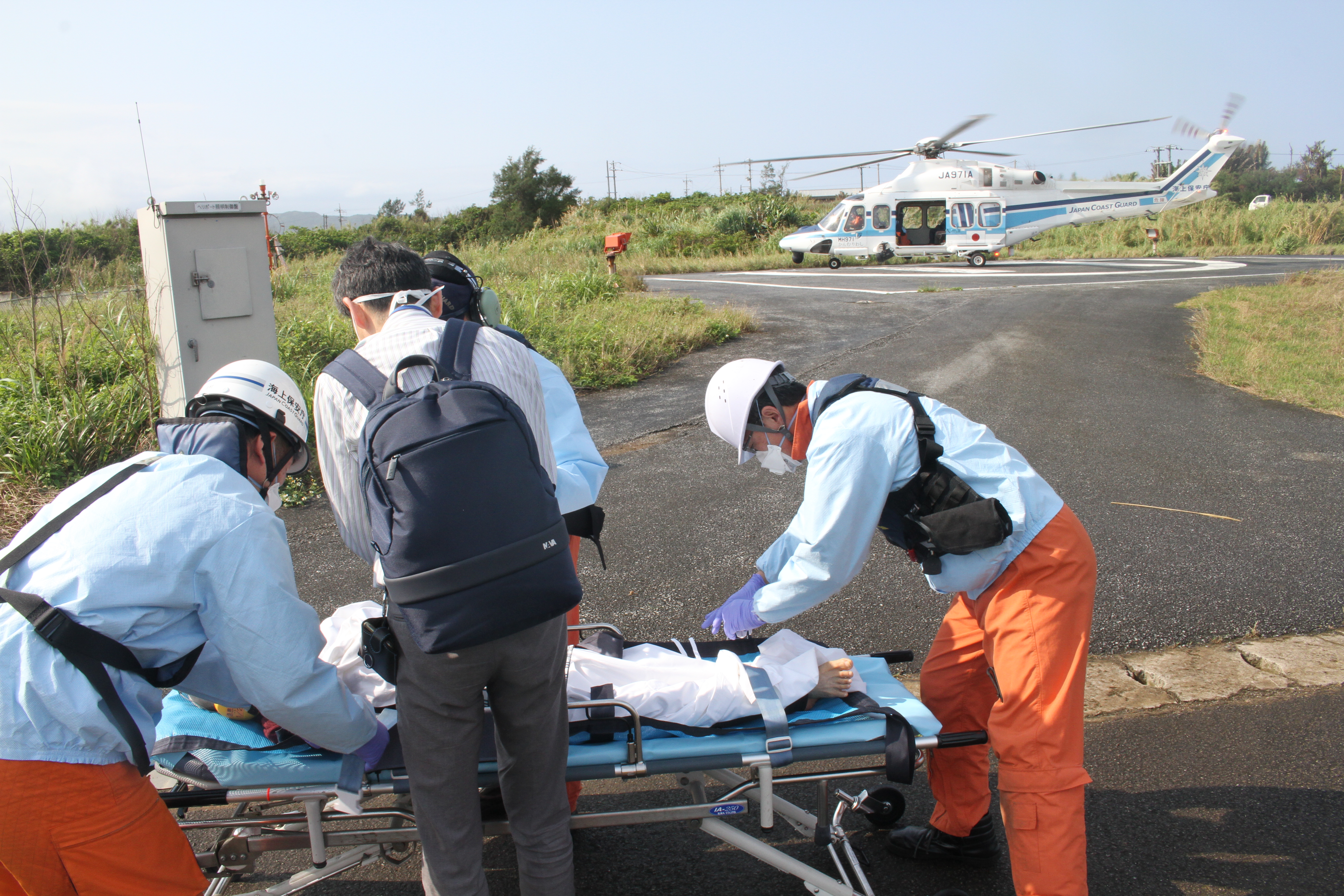 西表西部からの急患輸送 令和2年3月13日午前9時10分頃、沖縄県八重山事務所より急患輸送要請がありました。石垣航空基地所属ヘリコプターで西表西部HPから石垣空港への搬送を実施し、午前10時22分に石垣市消防本部の救急車に引き継いでいます。 患者:82歳男性 写真:西表西部HPにて患者引き受け時の様子。