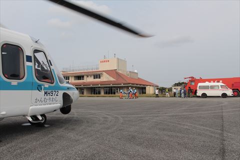 多良間島からの急患輸送 令和2年4月3日午後2時58分頃、沖縄県宮古事務所より急患輸送要請がありました。石垣航空基地所属ヘリコプターで多良間空港から石垣空港への搬送を実施し、午後4時10分に石垣市消防本部の救急車に引き継いでいます。 患者:79歳男性 写真:多良間空港にて患者引き受け時の様子。