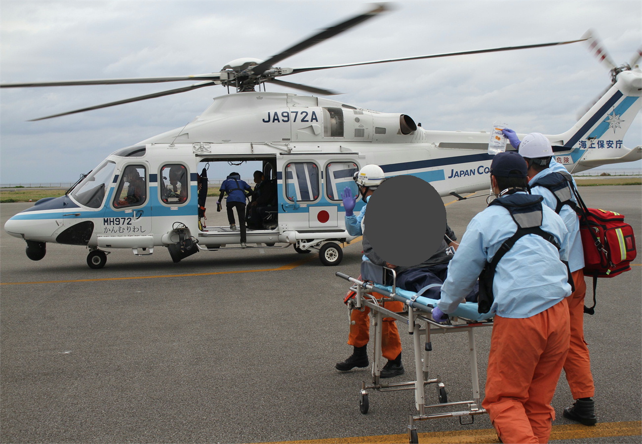 与那国島からの急患輸送 令和2年4月25日午前6時20分頃、沖縄県防災危機管理課より急患輸送要請がありました。石垣航空基地所属ヘリコプターで与那国島から石垣空港への搬送を実施し、午前8時51分に石垣市消防本部の救急車に引き継いでいます。 患者:45歳 男性 写真:与那国空港にて患者引き受けの様子