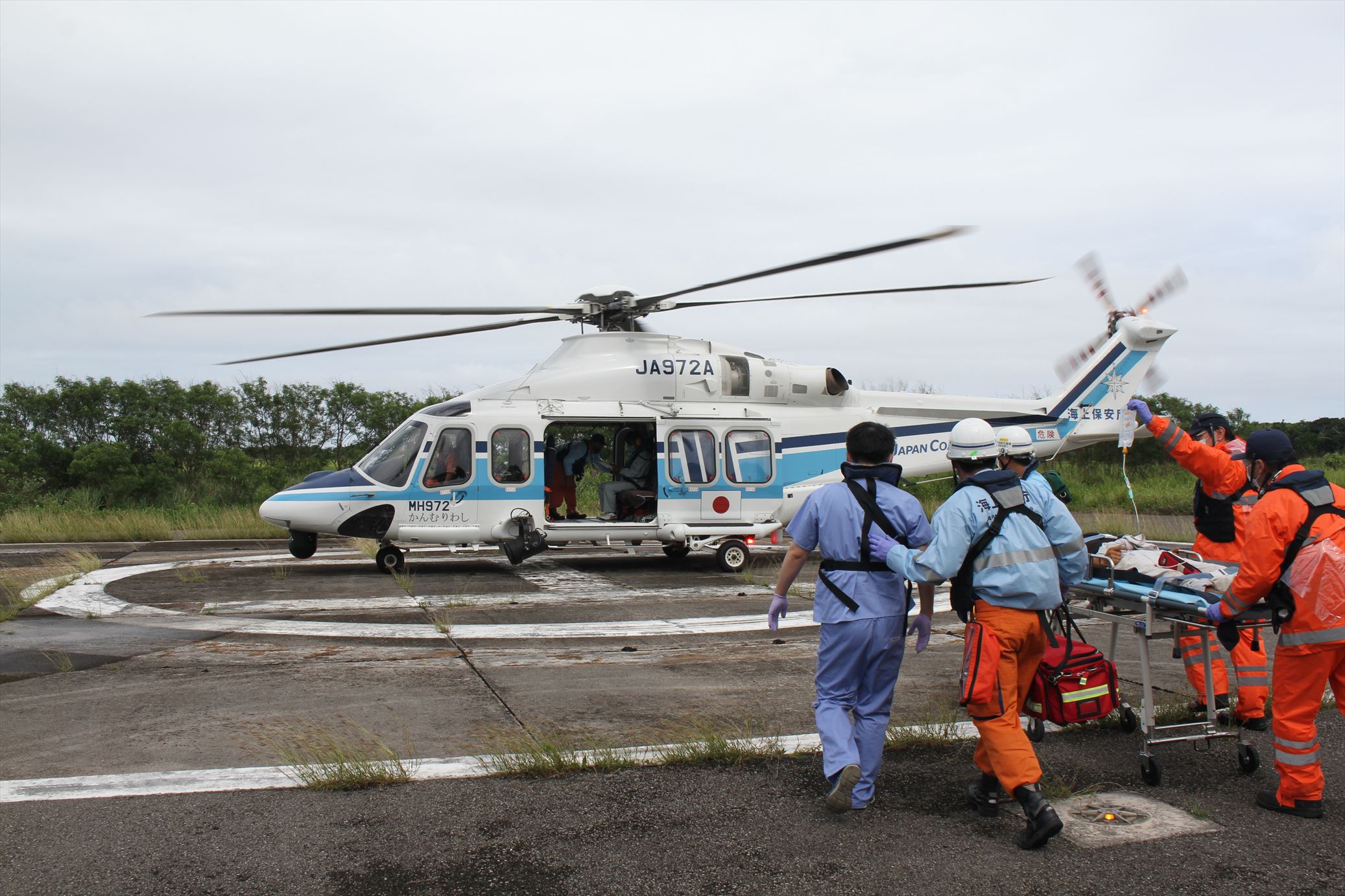 黒島からの急患輸送 令和2年5月15日午後2時36分頃、沖縄県八重山事務所より急患輸送要請がありました。石垣航空基地所属ヘリコプターで黒島HPから石垣空港への搬送を実施し、午後3時37分に石垣市消防本部の救急車に引き継いでいます。 患者:25歳 男性 写真:黒島HPにて患者収容時の様子