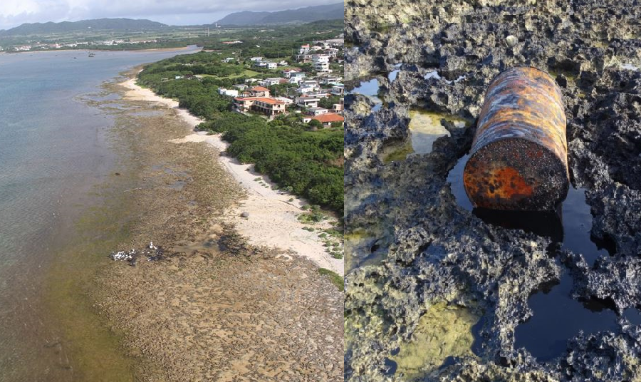 石垣島宮良海岸ドラム缶油流出情報 令和2年6月17日午前7時15分頃、石垣海上保安部へ「漂着したドラム缶から油が流出している」との通報があり石垣航空基地ヘリコプターが対応にあたりました。当基地ヘリコプターは上空から油の流出した範囲の調査を実施。石垣海上保安部の職員の他、一般人・警察・消防・石垣市水産課職員にて油の回収作業にあたりました。<写真左:石垣航空基地撮影、写真右:石垣海上保安部撮影>