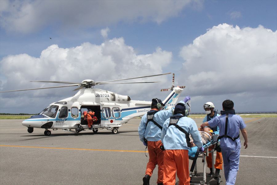 与那国島からの急患輸送 令和2年6月30日午前9時50分頃、沖縄県八重山事務所より急患輸送要請がありました。石垣航空基地所属ヘリコプターで与那国空港から石垣空港への搬送を実施し、午後12時15分に石垣市消防本部の救急車に引き継いでいます。 患者:80歳 男性 写真:与那国空港にて患者収容時の様子