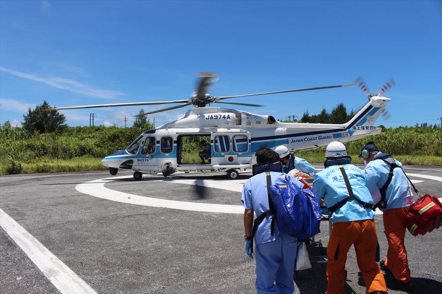 西表西部からの急患搬送 令和3年7月9日午後0時43分ころ、八重山事務所より急患輸送要請がありました。石垣航空基地所属ヘリコプターで西表西部ヘリポートから真栄里暫定ヘリポートへの搬送を実施し、午後1時24分に石垣市消防本部の救急車に引き継いでいます。 患者:70歳 男性 写真:西表西部ヘリポートにて患者引き受け時の様子