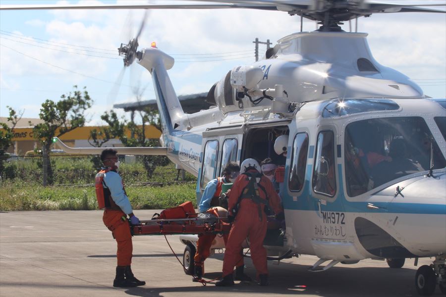 令和2年10月29日(木)午後零時50分頃、石垣市伊原間沖を航行中の貨物船乗組員より、「船長が倒れ、息をしていない」旨の通報を受け、石垣航空基地ヘリコプターが現場に急行しました。午後1時47分頃、同ヘリコプターから機動救難士を降下させ、要救助者をつり上げ、午後2時頃石垣航空基地にて石垣市消防本部へ引き継ぎました。