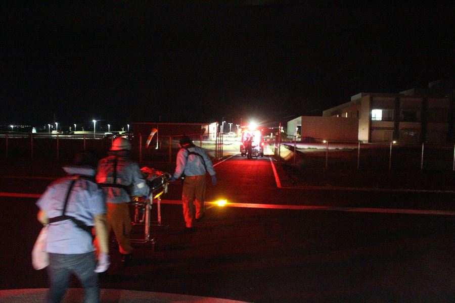 西表東部からの急患輸送 令和3年1月1日18時45分、沖縄県防災危機管理課より急患輸送要請がありました。石垣航空基地所属ヘリコプターで西表東部ヘリポートから真栄里暫定ヘリポートへの搬送を実施し、20時00分に石垣市消防本部の救急車に引き継いでいます。 患者:89歳 女性 写真:真栄里暫定ヘリポートにて患者引き継ぎ時の様子