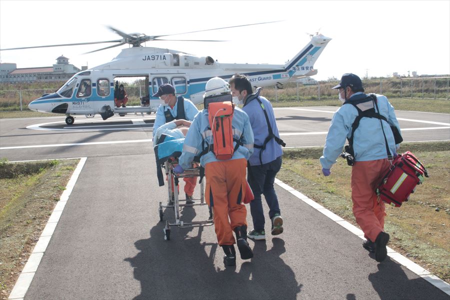 石垣島から宮古島への急患輸送 令和3年1月14日9時58分、沖縄県八重山事務所より急患輸送要請がありました。石垣航空基地所属ヘリコプターで真栄里暫定ヘリポートから宮古空港への搬送を実施し、11時10分に宮古島市消防本部の救急車に引き継いでいます。 患者:51歳 男性 写真:真栄里暫定ヘリポートにて患者引き受け時の様子