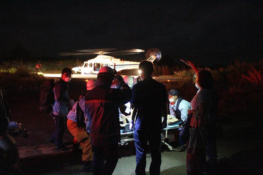 西表西部からの急患輸送 令和3年2月27日22時34分、沖縄県防災危機管理課より急患輸送要請がありました。石垣航空基地所属ヘリコプターで西表西部ヘリポートから真栄里暫定ヘリポートへの搬送を実施し、0時51分に石垣市消防本部の救急車に引き継いでいます。 患者:83歳 男性 写真:西表西部ヘリポートにて患者引き受け時の様子