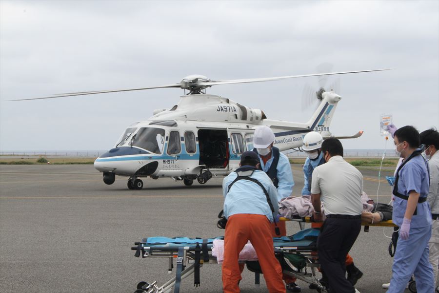 与那国島からの急患搬送 令和3年3月5日10時40分、八重山事務所より急患輸送要請がありました。石垣航空基地所属ヘリコプターで与那国空港から真栄里暫定ヘリポートへの搬送を実施し、12時13分に石垣市消防本部の救急車に引き継いでいます。 患者:79歳 女性 写真:与那国空港にて患者引き受け時の様子