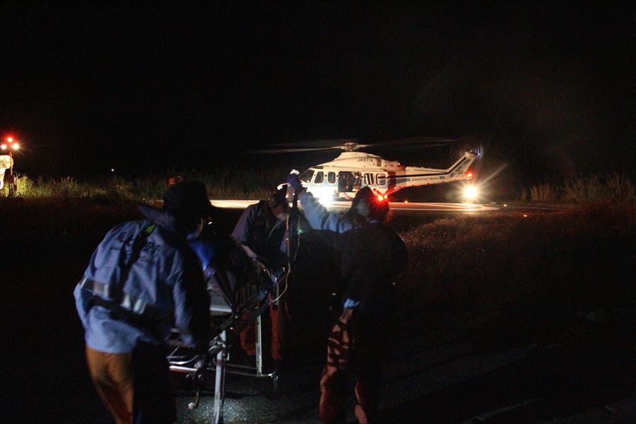 西表西部からの急患搬送 令和3年3月14日22時30分、沖縄県防災危機管理課より急患輸送要請がありました。石垣航空基地所属ヘリコプターで西表西部ヘリポートから真栄里暫定ヘリポートへの搬送を実施し、23時02分に石垣市消防本部の救急車に引き継いでいます。 患者:60歳 男性 写真:西表西部ヘリポートにて患者引き受け時の様子