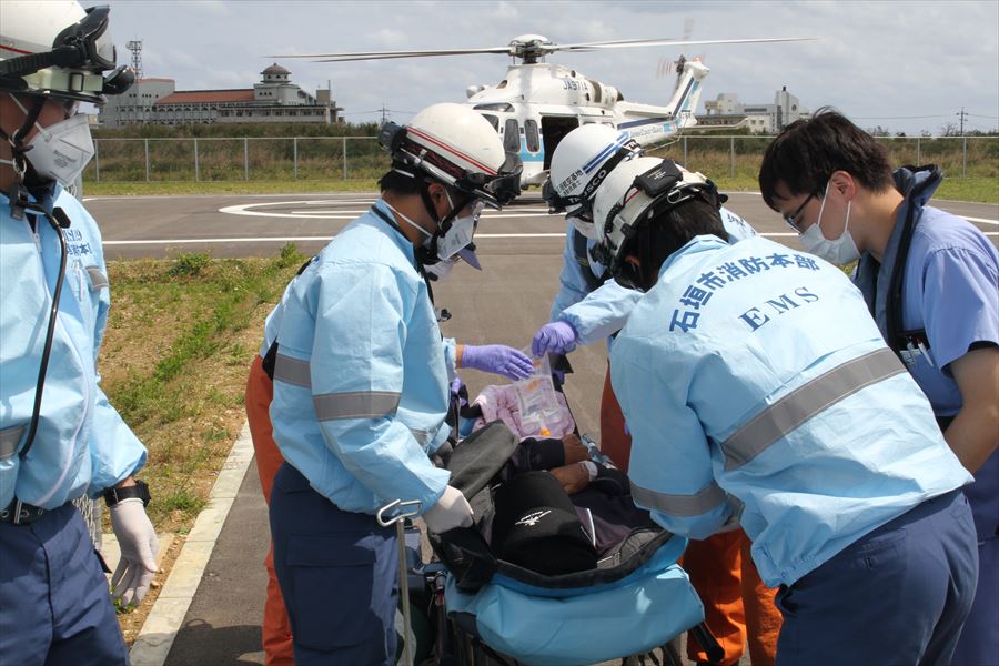 与那国島からの急患搬送 令和3年3月23日午後0時30分ころ、八重山事務所より急患輸送要請がありました。石垣航空基地所属ヘリコプターで与那国空港から真栄里暫定ヘリポートへの搬送を実施し、午後1時59分に石垣市消防本部の救急車に引き継いでいます。 患者:72歳 男性 写真:真栄里暫定ヘリポートにて患者引き継ぎ時の様子