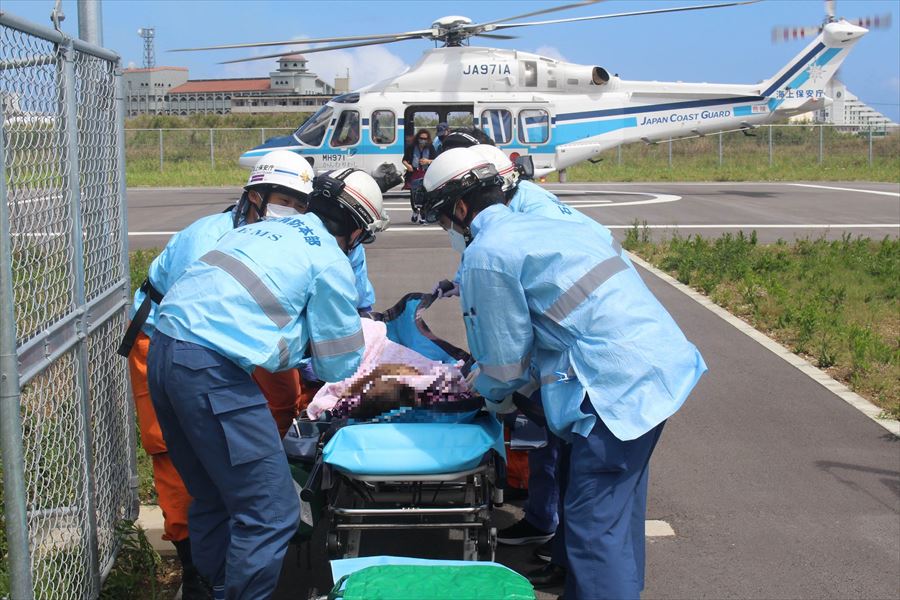 与那国島からの急患搬送 令和3年5月6日午後1時06分ころ、八重山事務所より急患輸送要請がありました。石垣航空基地所属ヘリコプターで与那国空港から真栄里暫定ヘリポートへの搬送を実施し、午後2時34分に石垣市消防本部の救急車に引き継いでいます。 患者:90歳 女性 写真:真栄里暫定ヘリポートにて患者引き継ぎ時の様子