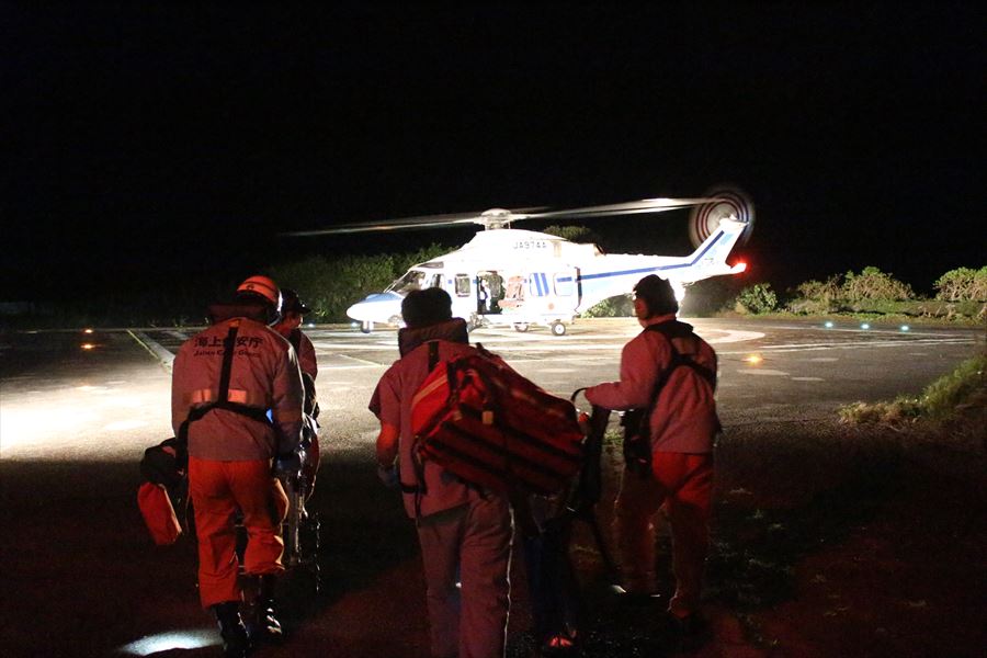 鳩間島からの急患搬送 令和3年5月13日午後8時14分ころ、沖縄県防災危機管理課より急患輸送要請がありました。石垣航空基地所属ヘリコプターで鳩間ヘリポートから真栄里暫定ヘリポートへの搬送を実施し、午後9時50分に石垣市消防本部の救急車に引き継いでいます。 患者:41歳 男性 写真:鳩間ヘリポートにて患者引き受け時の様子