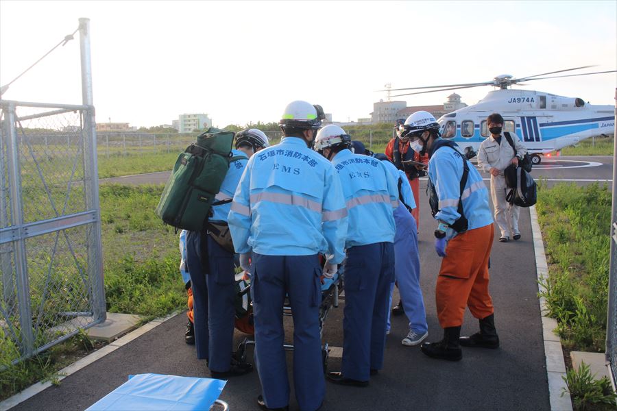 与那国島からの急患搬送 令和3年5月16日午前4時28分ころ、沖縄県防災危機管理課より急患輸送要請がありました。石垣航空基地所属ヘリコプターで与那国空港から真栄里暫定ヘリポートへの搬送を実施し、午前6時50分に石垣市消防本部の救急車に引き継いでいます。 患者:57歳 男性 写真:真栄里暫定ヘリポートにて患者引き継ぎ時の様子
