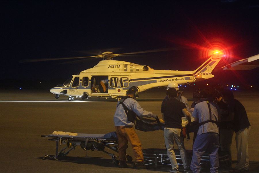 与那国島からの急患搬送 令和3年7月30日午後6時8分ころ、沖縄県防災危機管理課より急患輸送要請がありました。石垣航空基地所属ヘリコプターで与那国空港から真栄里暫定ヘリポートへの搬送を実施し、午後8時43分に石垣市消防本部の救急車に引き継いでいます。 患者:79歳 男性 写真:与那国空港にて患者引き受け時の様子
