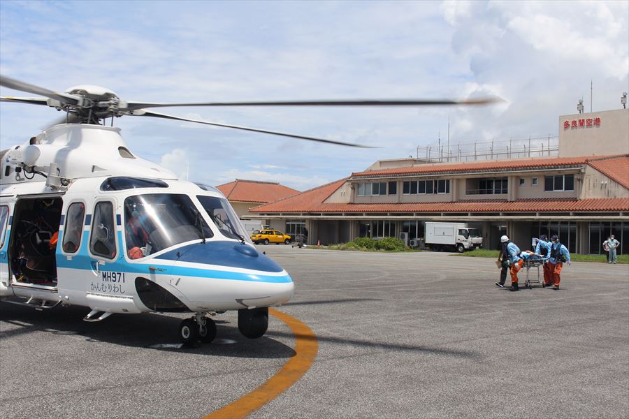 多良間島からの急患搬送 令和3年8月18日午後0時44分ころ、宮古事務所より急患輸送要請がありました。石垣航空基地所属ヘリコプターで多良間空港から真栄里暫定ヘリポートへの搬送を実施し、午後1時54分に石垣市消防本部の救急車に引き継いでいます。 患者:80歳 男性 写真:多良間空港にて患者引き受け時の様子