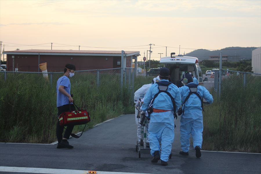 与那国島からの急患搬送 令和3年9月15日午後4時24分ころ、八重山事務所より急患輸送要請がありました。石垣航空基地所属ヘリコプターで与那国空港から真栄里暫定ヘリポートへの搬送を実施し、午後6時12分に石垣市消防本部の救急車に引き継いでいます。 患者:74歳 男性 写真:真栄里暫定ヘリポートにて患者引き継ぎ時の様子