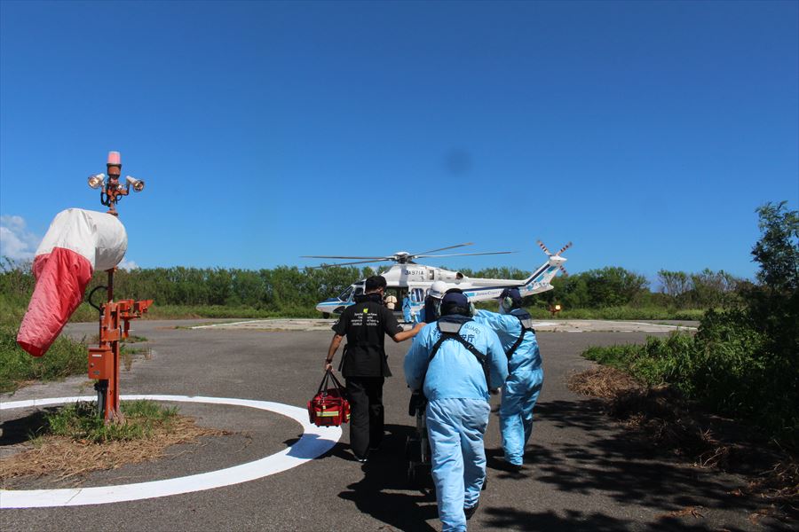 黒島からの急患搬送 令和3年9月26日午後0時25分ころ、沖縄県防災危機管理課より急患輸送要請がありました。石垣航空基地所属ヘリコプターで黒島ヘリポートから真栄里暫定ヘリポートへの搬送を実施し、午後2時9分に石垣市消防本部の救急車に引き継いでいます。 患者:89歳 女性 写真:黒島ヘリポートにて患者引き受け時の様子