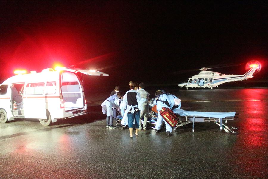 多良間島からの急患搬送 令和3年10月10日午後10時20分ころ、沖縄県防災危機管理課より急患輸送要請がありました。石垣航空基地所属ヘリコプターで多良間空港から真栄里暫定ヘリポートへの搬送を実施し、午前1時44分に石垣市消防本部の救急車に引き継いでいます。 患者:52歳 男性 写真:多良間空港にて患者引き受け時の様子