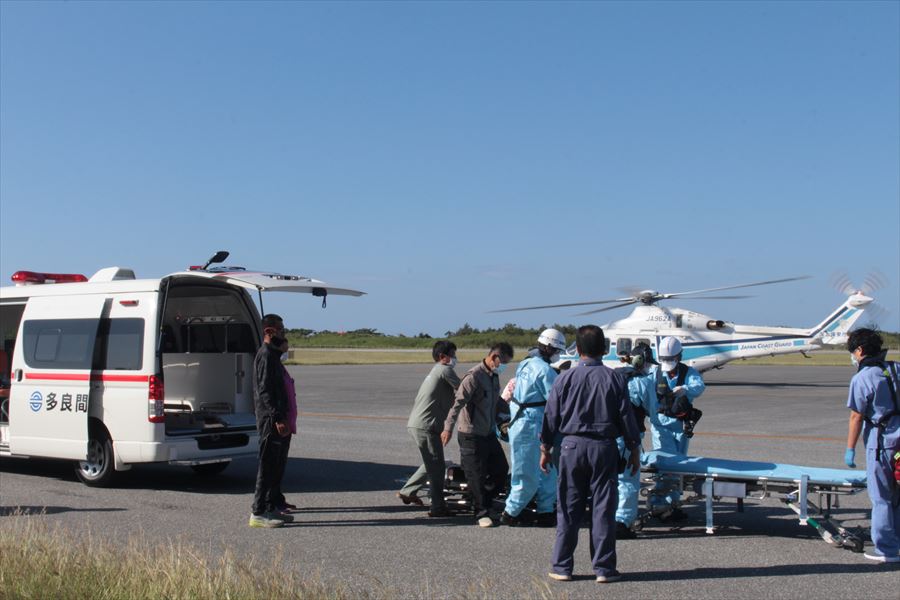 多良間島からの急患搬送 令和3年10月29日午前8時44分ころ、宮古事務所より急患輸送要請がありました。石垣航空基地所属ヘリコプターで多良間空港から真栄里暫定ヘリポートへの搬送を実施し、午前9時55分に石垣市消防本部の救急車に引き継いでいます。 患者:86歳 男性 写真:多良間空港にて患者引き受け時の様子