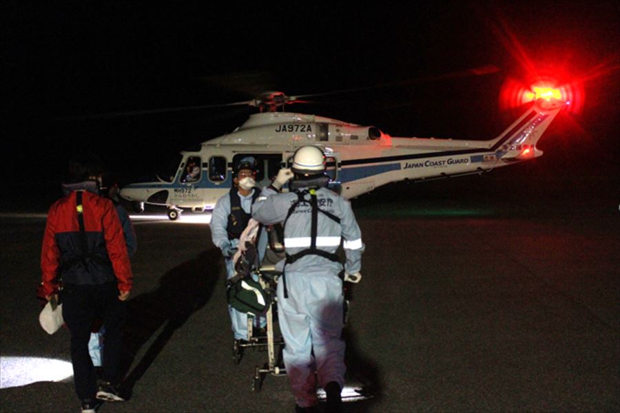 多良間島からの急患搬送 令和3年11月29日午後11時47分ころ、沖縄県防災危機管理課より急患輸送要請がありました。石垣航空基地所属ヘリコプターで多良間空港から真栄里暫定ヘリポートへの搬送を実施し、翌午前1時22分に石垣市消防本部の救急車に引き継いでいます。 患者:82歳 女性 写真:多良間空港にて患者引き受け時の様子