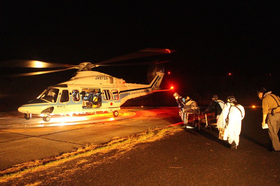 黒島からの急患搬送 令和3年11月29日午後8時57分ころ、沖縄県防災危機管理課より急患輸送要請がありました。石垣航空基地所属ヘリコプターで黒島ヘリポートから真栄里暫定ヘリポートへの搬送を実施し、午後11時14分に石垣市消防本部の救急車に引き継いでいます。 患者:42歳 女性 写真:黒島ヘリポートにて患者引き受け時の様子