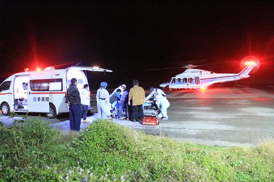 多良間島からの急患搬送 令和4年2月1日午後11時10分ころ、沖縄県防災危機管理課より急患輸送要請がありました。石垣航空基地所属ヘリコプターで多良間空港から真栄里暫定ヘリポートへの搬送を実施し、午前1時10分に石垣市消防本部の救急車に引き継いでいます。 患者:79歳 男性 写真:多良間空港にて患者引き受け時の様子