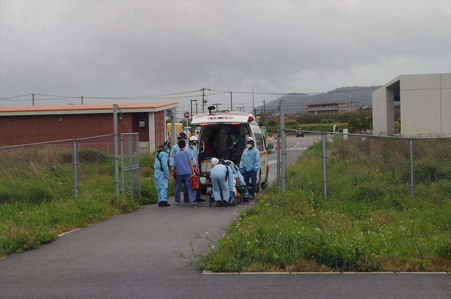 患者:54歳 男性 写真:真栄里暫定ヘリポートにて患者引き渡し時の様子