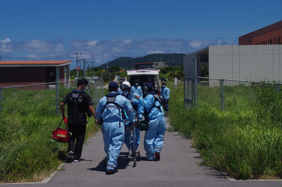 患者:95歳 女性 写真:真栄里暫定ヘリポートにて患者引き継ぎ時の様子