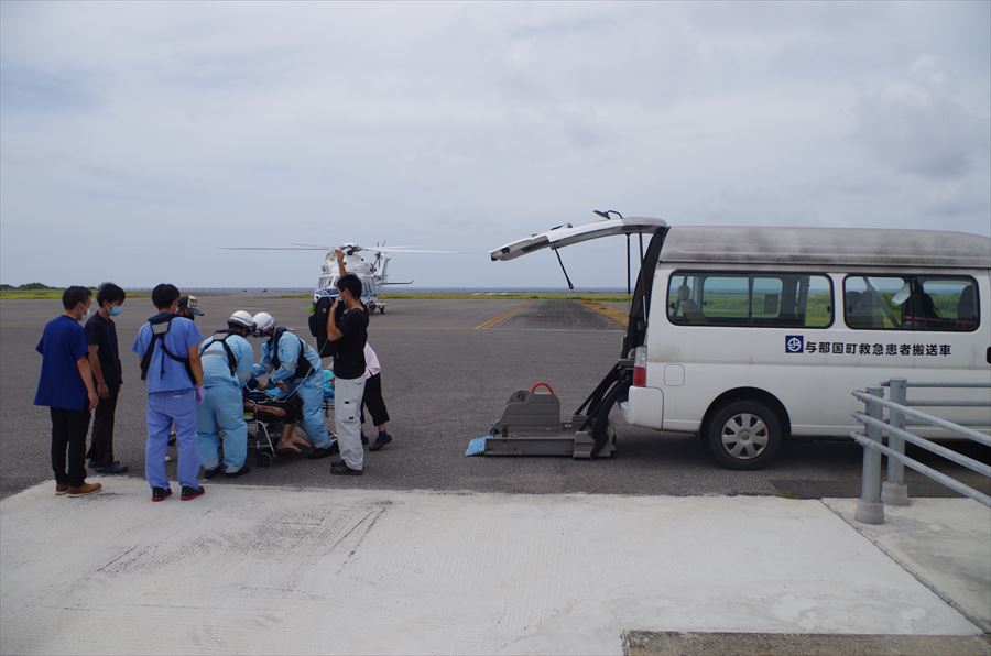 患者:73歳 男性 写真:与那国空港にて患者引き受け時の様子