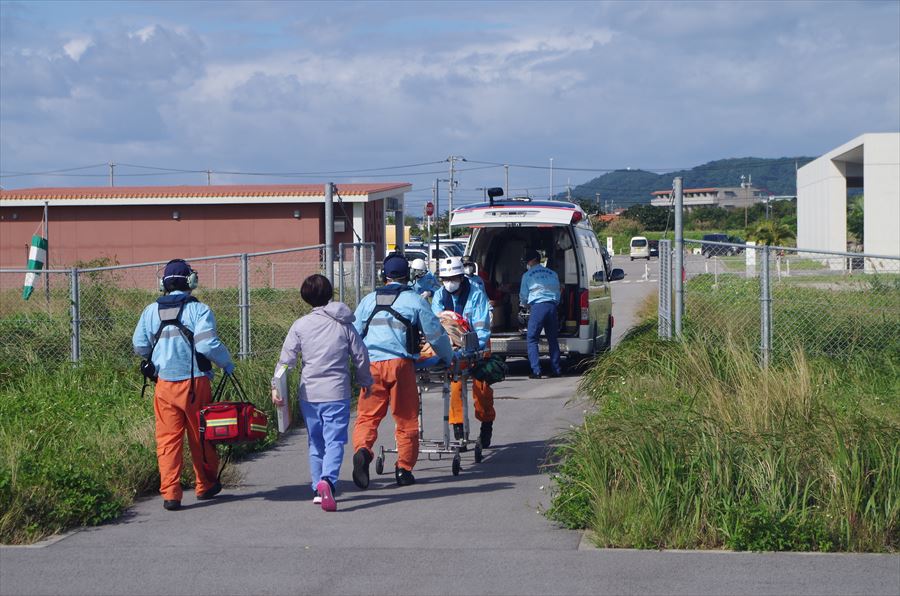 患者:8歳 女性 写真:真栄里暫定ヘリポートにて患者引き継ぎ時の様子