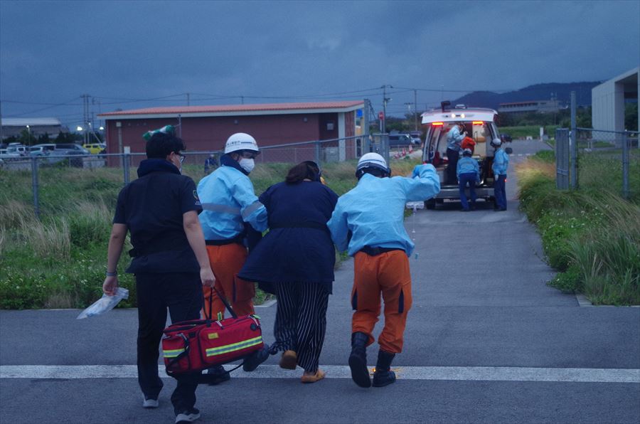 患者:40歳 女性 写真:真栄里暫定ヘリポートにて患者引き継ぎ時の様子