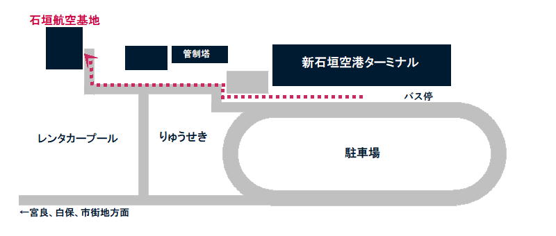 地図 新石垣空港ターミナル南西側徒歩3分 石垣島市街地から車で約25分 第十一管区海上保安本部 石垣航空基地〒907-0244 沖縄県石垣市字盛山222番地282号 TEL&FAX:0980-86-8511