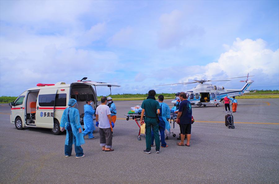 多良間島からの急患搬送 令和5年7月29日午前9時31分頃、沖縄県防災危機管理課より急患輸送要請がありました。石垣航空基地所属ヘリコプターで多良間空港から真栄里暫定ヘリポートへの搬送を実施し、午前10時57分に石垣市消防本部の救急車に引き継いでいます。 患者81歳 女性 写真:多良間空港にて患者引きけの様子