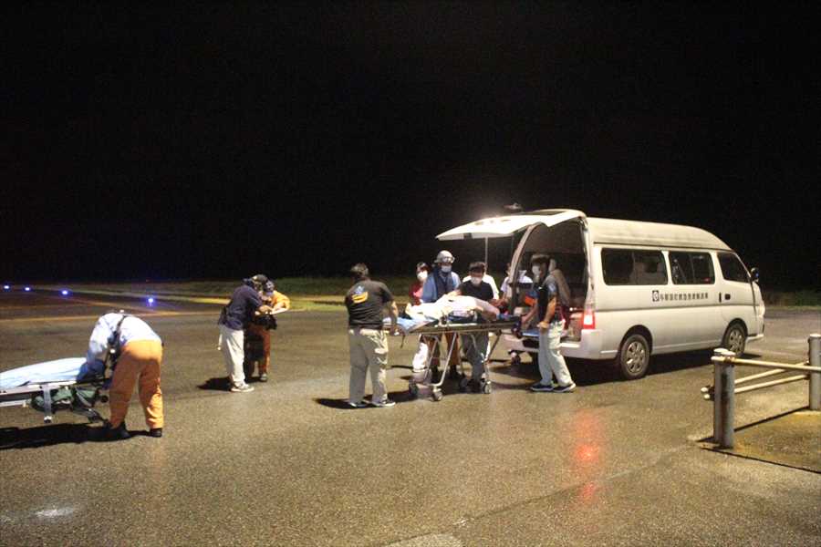 与那国からの急患輸送 令和2年8月4日午後7時49分頃、沖縄県防災危機管理課より急患輸送要請がありました。石垣航空基地所属ヘリコプターで与那国空港から新石垣空港への搬送を実施し、午後10時3分に石垣市消防本部の救急車に引き継いでいます。 患者:68歳 男性 写真:与那国空港にて患者収容時の様子