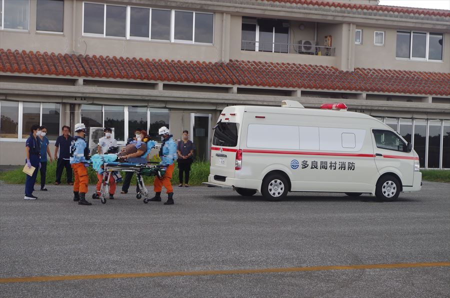 多良間島からの急患搬送 令和5年9月5日午後1時47分、宮古島事務所より急患輸送要請がありました。石垣航空基地所属ヘリコプターで多良間空港から真栄里暫定ヘリポートへの搬送を実施し、午前3時08分に石垣市消防本部の救急車に引き継いでいます。 患者51歳 女性 写真:多良間島から患者引き受けの様子