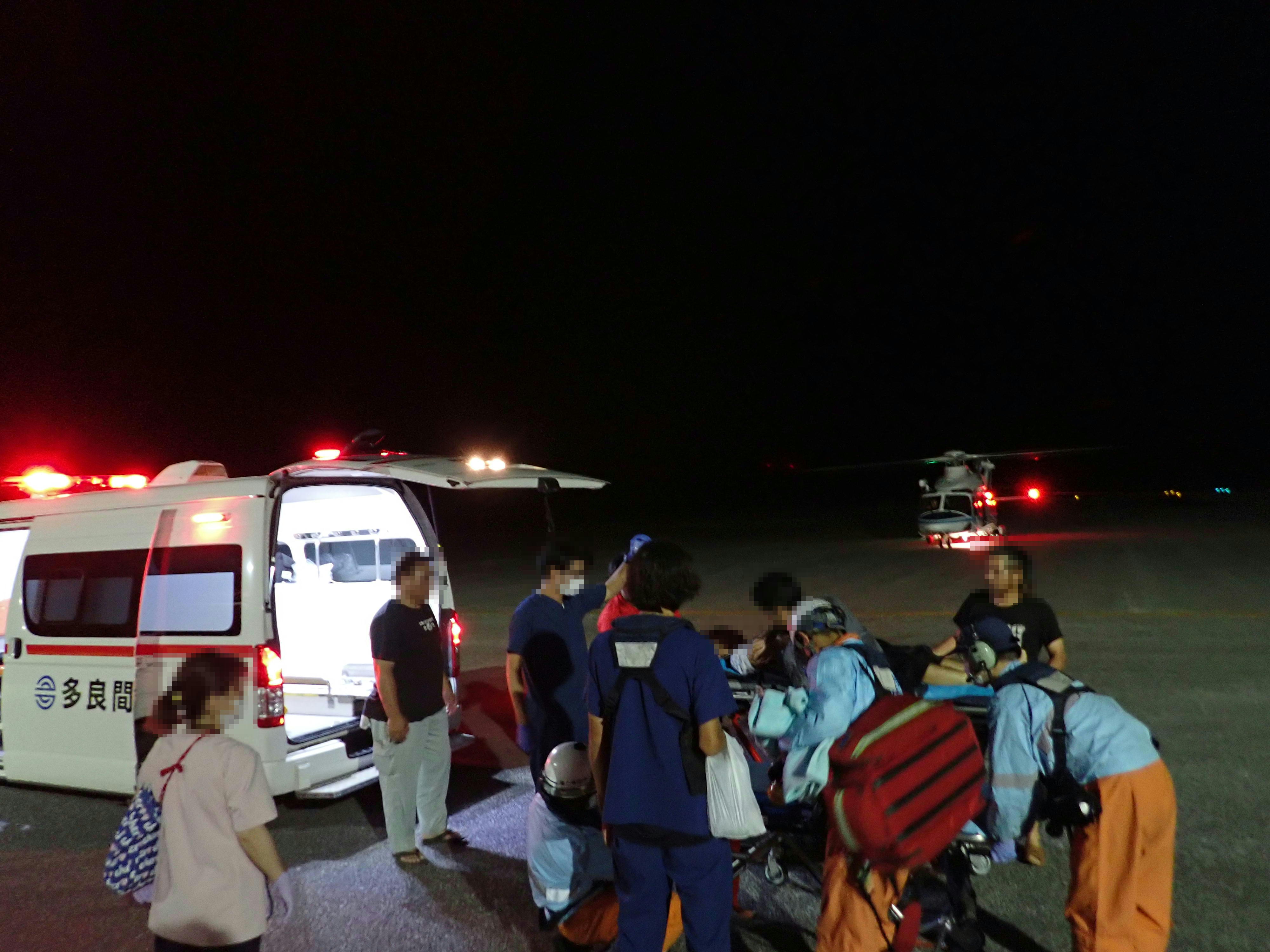 多良間島からの緊急搬送 令和6年9月2日午後11時51分、沖縄県防災危機管理課から当基地に対して急患輸送要請がありました。石垣航空基地所属ヘリコプターで多良間空港から真栄里暫定ヘリポートへの搬送を実施し、9月3日午前1時30分に石垣市消防本部の救急車に引き継いでいます。 患者66歳 男性 写真:多良間空港からの患者引き受けの様子
