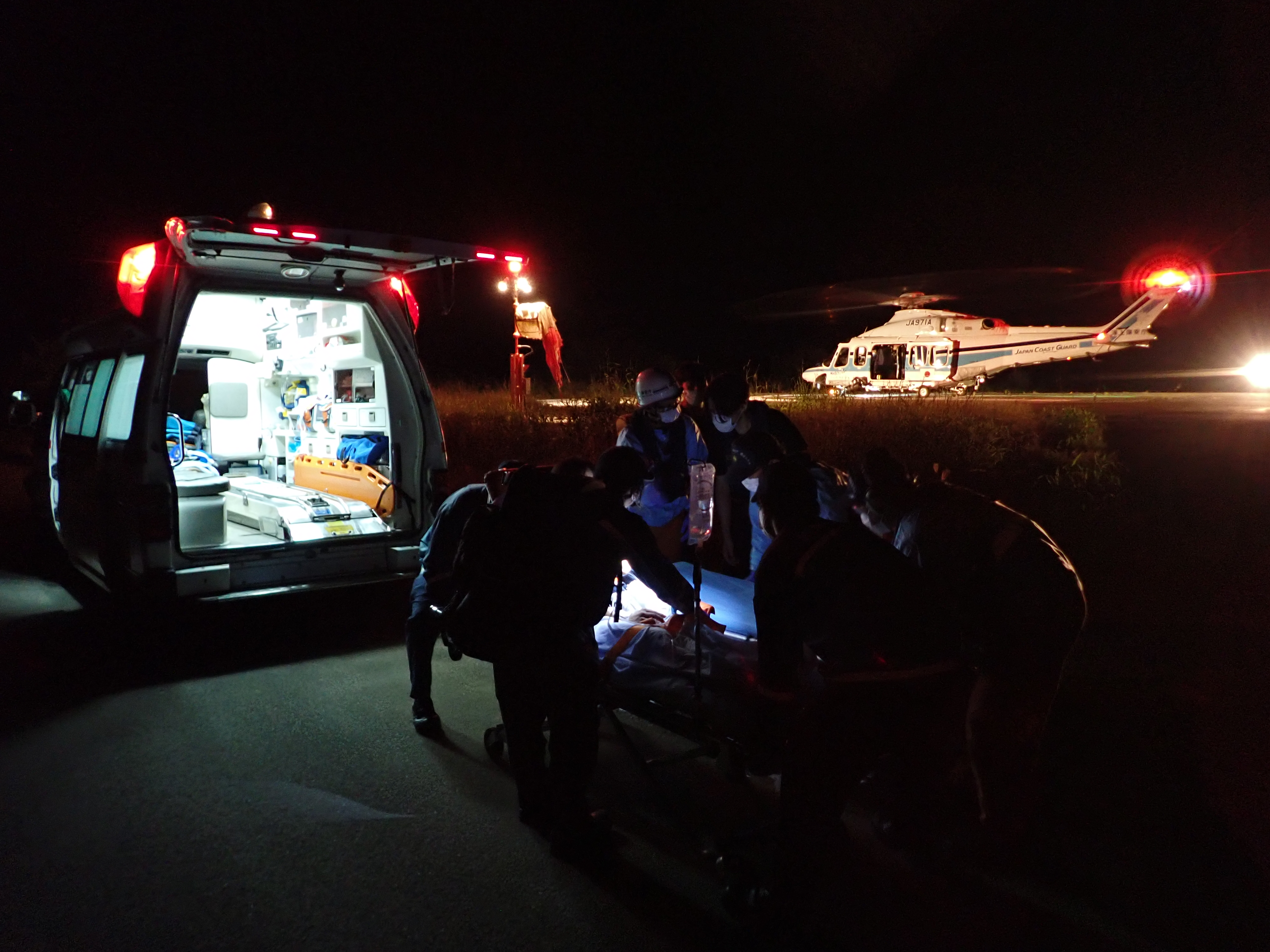 西表島からの緊急搬送 令和6年10月15日午前1時27分、沖縄県防災危機管理課から当基地に対して急患輸送要請がありました。石垣航空基地所属ヘリコプターで西表島東部ヘリポートから真栄里暫定ヘリポートへの搬送を実施し、10月15日午前3時10分に石垣市消防本部の救急車に引き継いでいます。 患者51歳 女性 写真:西表島東部ヘリポートからの患者引き受けの様子