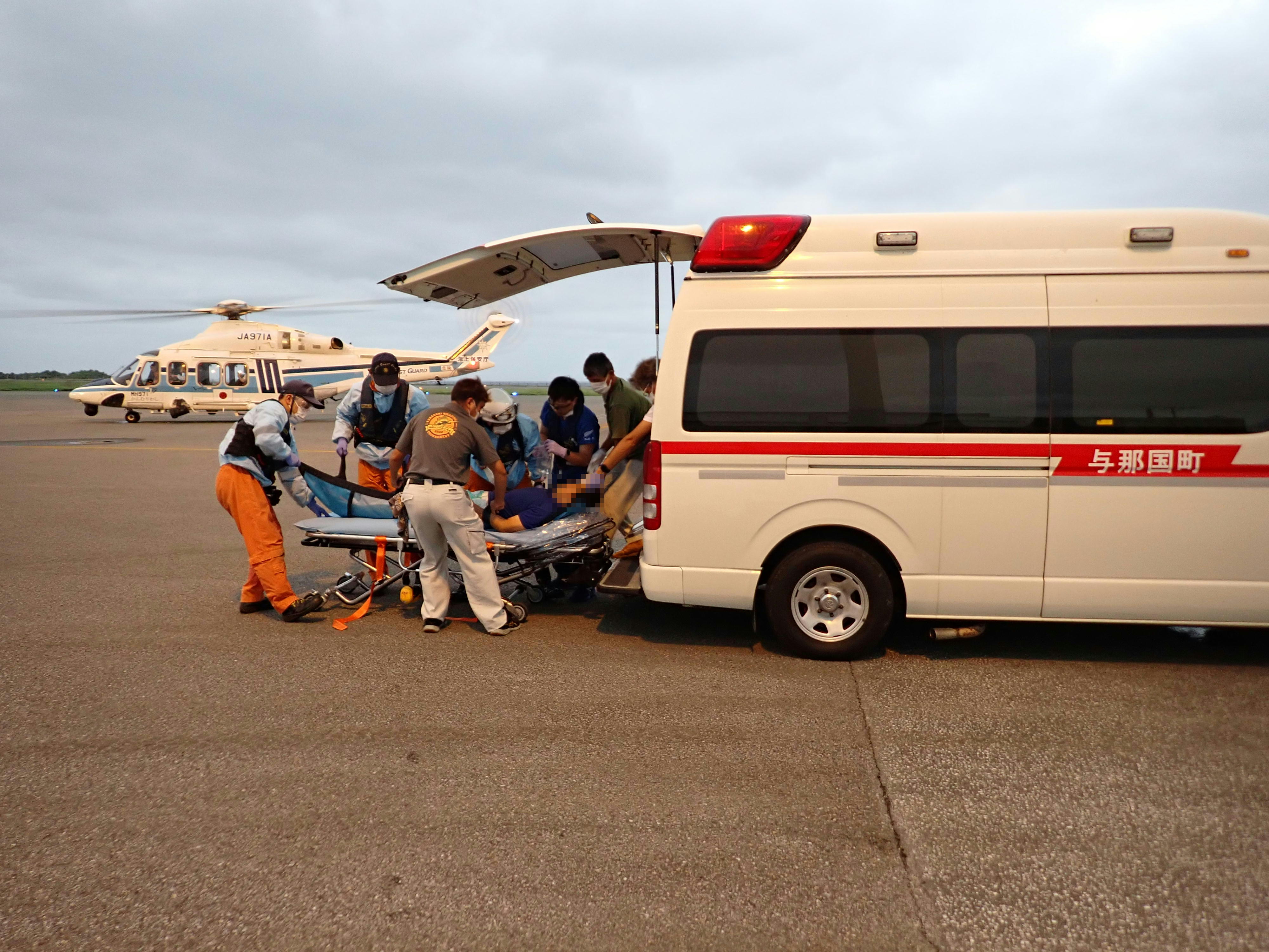 与那国島からの緊急搬送 令和6年10月29日午後4時30分、八重山事務所から当基地に対して急患輸送要請がありました。石垣航空基地所属ヘリコプターで与那国空港から真栄里暫定ヘリポートへの搬送を実施し、10月29日午後6時47分に石垣市消防本部の救急車に引き継いでいます。 患者71歳 男性 写真:与那国空港からの患者引き受けの様子